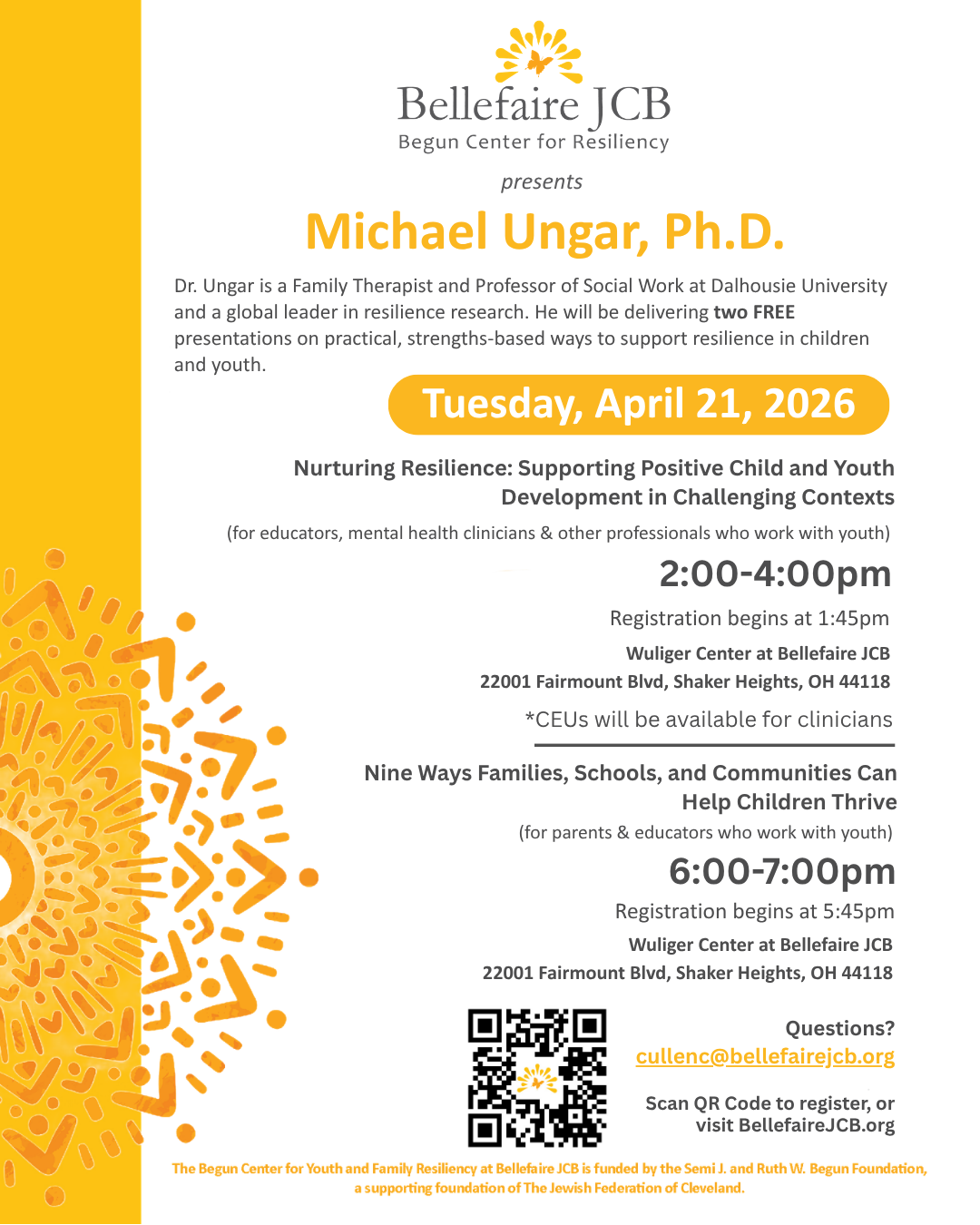 Dr. Ungar describes resilience as a process shaped by supportive relationships, access to resources, and systems that respond well during times of stress. His work focuses on improving outcomes for children, youth, and families, particularly those facing mental health challenges. As part of this work, he will be delivering two FREE presentations on practical, strengths-based ways to support resilience in children and youth: one presentation designed for parents and educators; and one for educators, mental health clinicians and other professionals who work with youth.